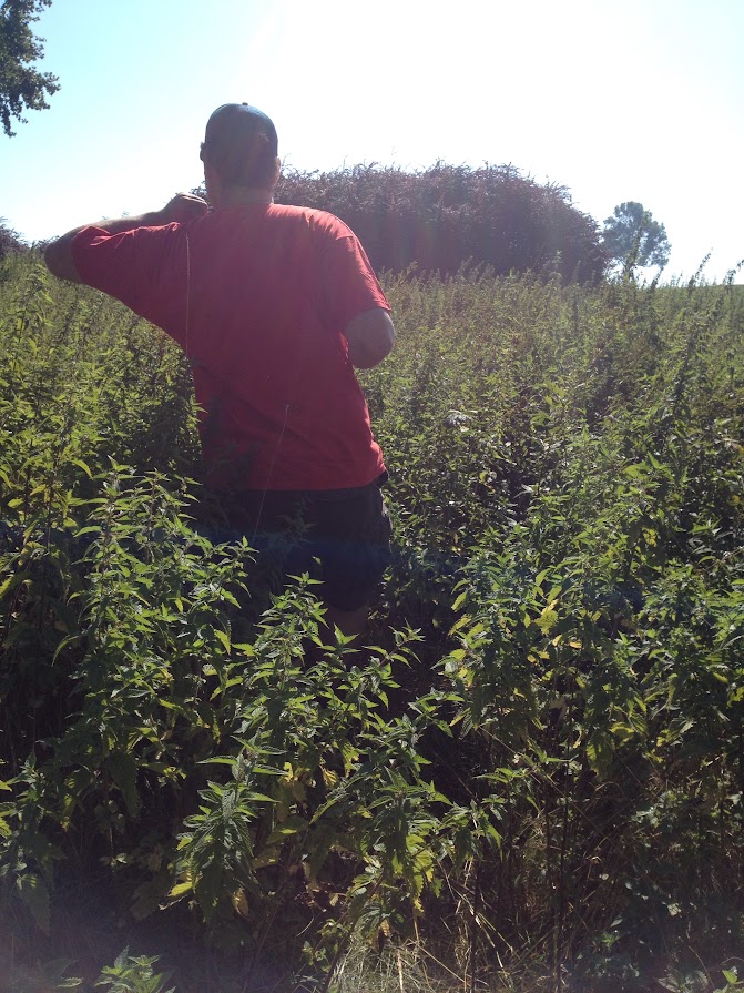 Hole 4, das erste Blindhole. Der Korb befindet sich leicht links vom Fairway, hinter einem Baum und ist mit ein paar Schritten Entfernung vom Tee aus sichtbar. Auf der linken Seite nach dem Bach wartet eine Armada an Brennesseln darauf, die Durchblutung anzuregen, wenn man vom Fairway abkommt. Dieses Hole ist wieder eher für Rechtshänder gemacht.
